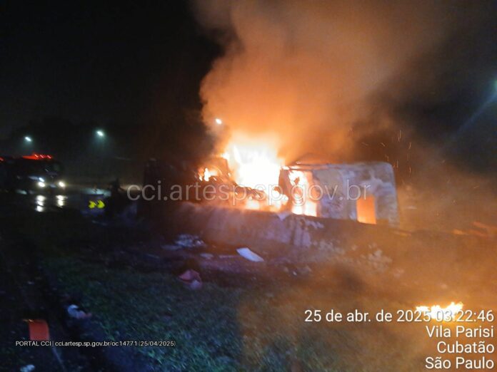 Um caminhão pegou fogo após tombar enquanto trafegava na Rodovia Cônego Domênico Rangoni, na altura da cidade de Cubatão, litoral paulista, na madrugada desta sexta-feira (25). Apesar do susto, ninguém ficou ferido.