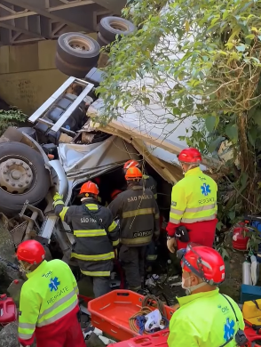 O caminhão, antes de cair, bateu no guard-rail da via. Segundo o Corpo de Bombeiros, o condutor ficou preso pelas pernas na cabine do caminhão.