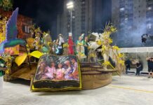 As fantasias da escola tricolor dominaram as vias do Sambódromo Dráuzio da Cruz, na noite de sexta-feira (21). Com 30 anos de história, o Grêmio Recreativo Cultural Escola de Samba Acadêmicos Bandeirantes do Saboó foi a primeira do grupo especial a desfilar. Trazendo o patrimônio imaterial da cidade de Santos como enredo, o famoso pão cará.