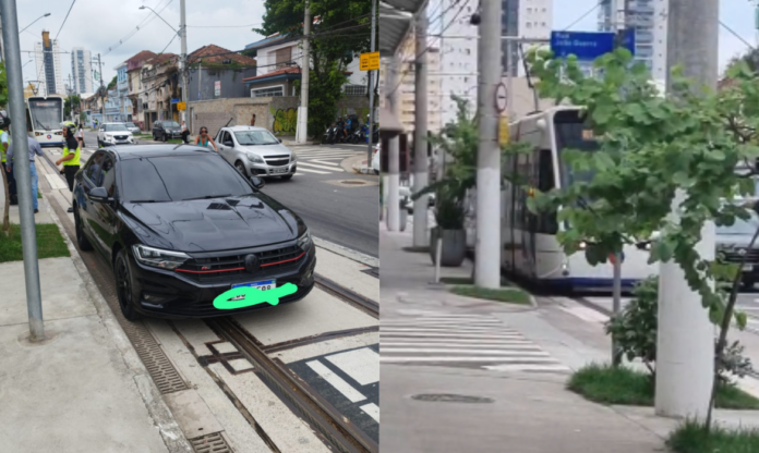 Um carro estacionado irregularmente em cima da linha do VLT (Veículo Leve Sobre Trilhos) de Santos, situado no Centro da cidade, resultou no atraso de quase uma hora no período de testes, na manhã desta quarta-feira (26).