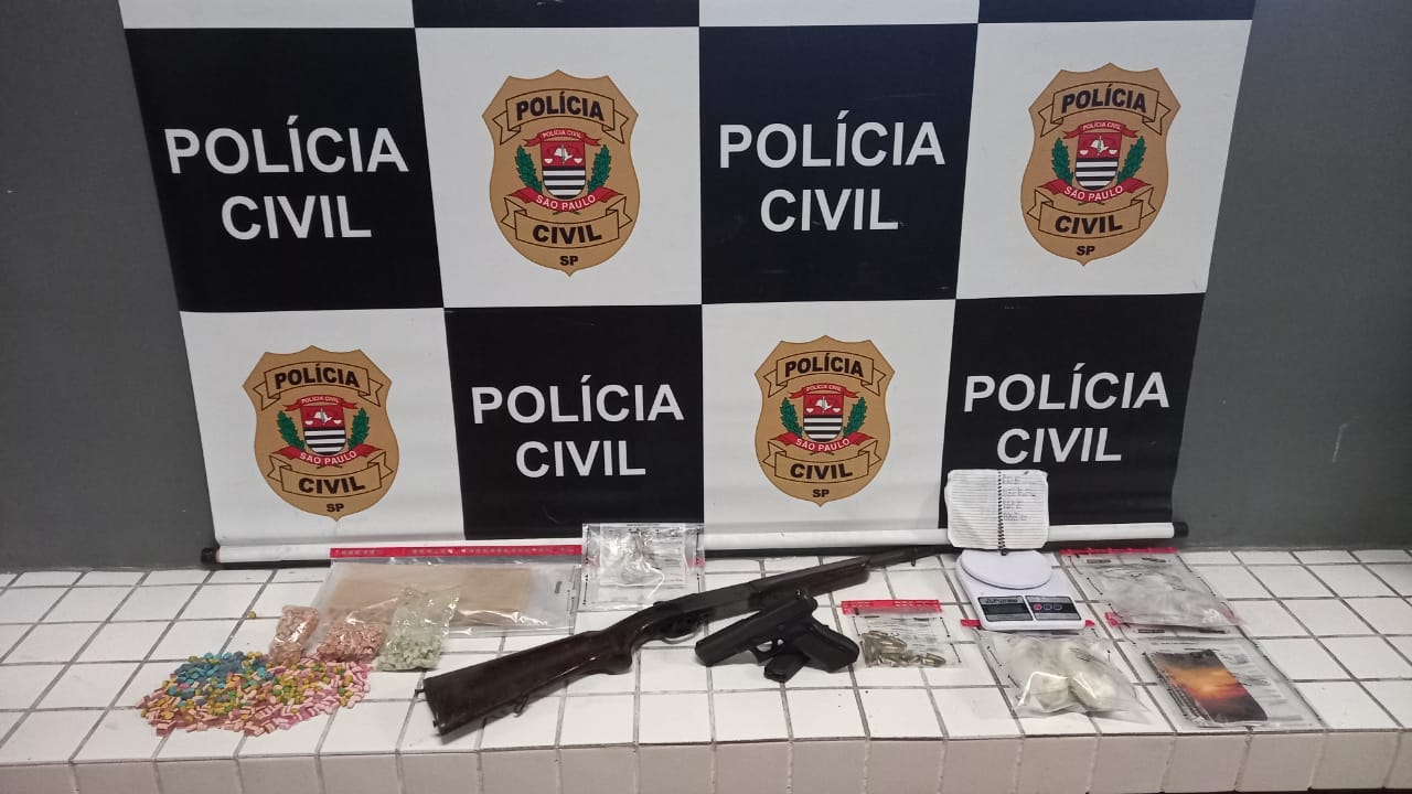 Na “central do tráfico”, foram encontradas porções de drogas, como cocaína, skunk, ecstasy e maconha, além de uma espingarda, uma pistola 9 milímetros, e dois veículos (carro e moto).