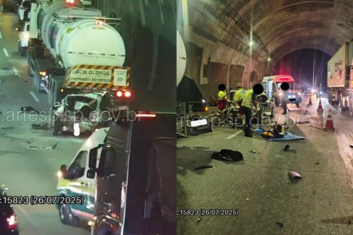 Um acidente envolvendo dois carros, um ônibus de viagem e uma carreta feriu cinco pessoas em um túnel da Rodovia Imigrantes, sentido Capital. As colisões aconteceram na altura do bairro Vila Margarida, na cidade de São Vicente, no litoral de São Paulo. De acordo com a Agência de Transporte do Estado de São Paulo (Artesp), por conta do acidente, houve bloqueio de duas faixas e congestionamento de dois quilômetros na via.