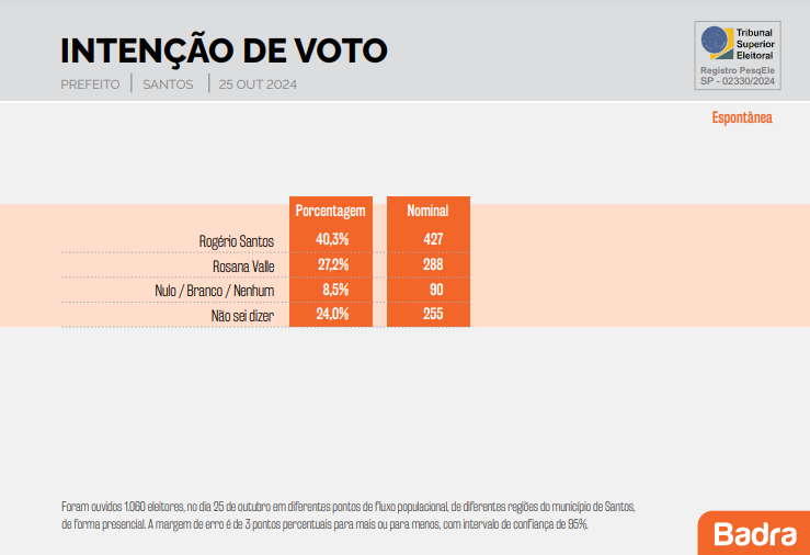 Na pesquisa espontânea de intenção de voto, Rogério Santos lidera com 40,3%. Atrás, aparece Rosana Valle, com 27,2%. Votariam em nulo/branco/nenhum 8,5% e não souberam dizer, 24,0%.