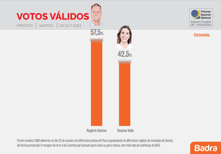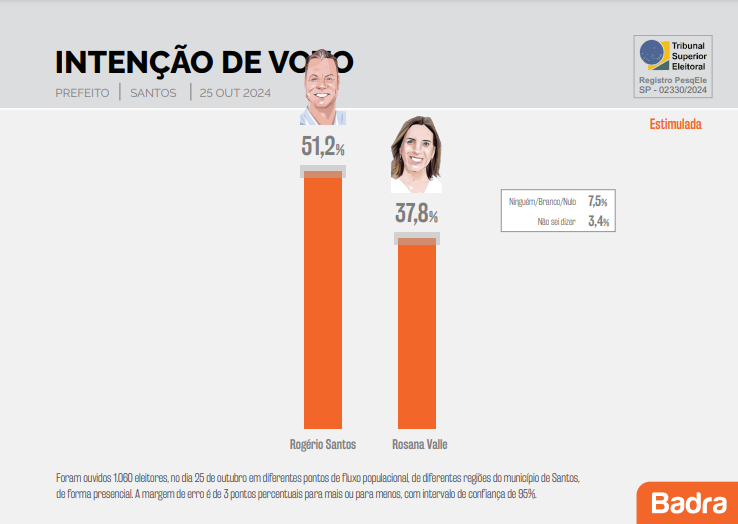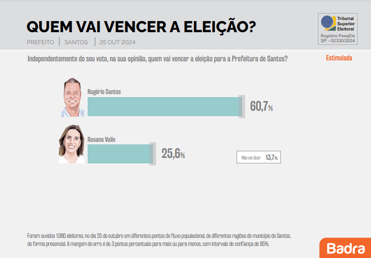Quando os eleitores foram questionados: “Independentemente do seu voto, na sua opinião, quem vai vencer a eleição para a prefeitura de Santos?”, Rogério Santos aparece com 60,7% e Rosana Valle com 25,6%. Não souberam dizer, 13,7%.