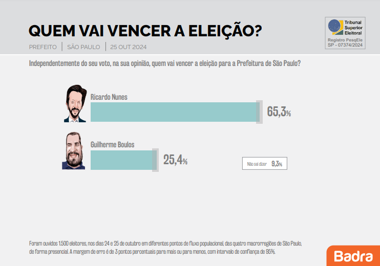 Quando os eleitores foram questionados: “Independentemente do seu voto, na sua opinião, quem vai vencer a eleição para a prefeitura de São Paulo?”, Ricardo Nunes aparece com 65,3% e Guilherme Boulos com 25,4%. Não souberam dizer, 9,3%.
