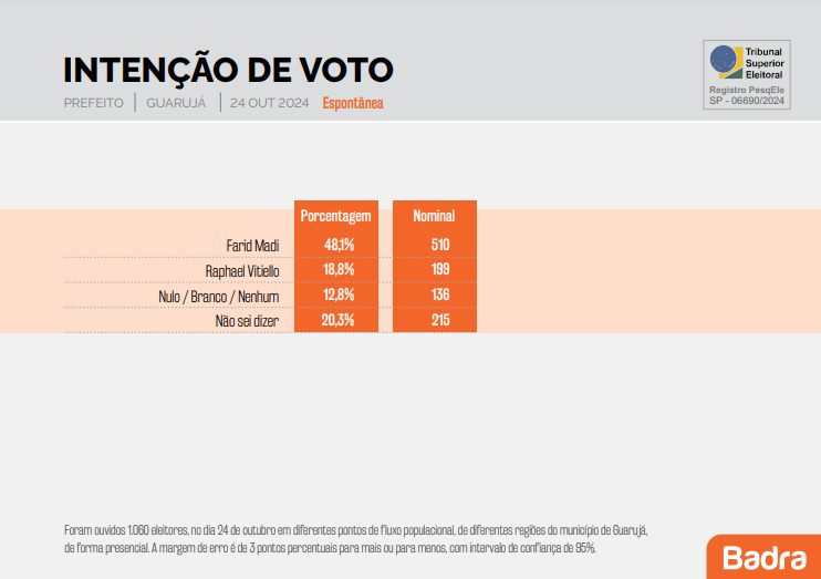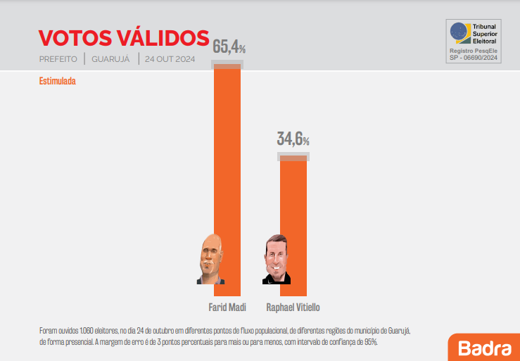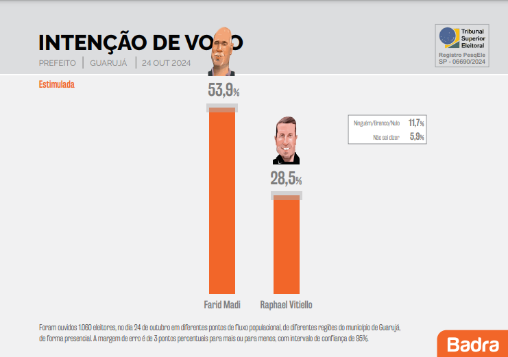 Neste sábado (26), a Tv Thathi Band Litoral apresentou ao vivo, o programa “Thathi Cidade: Especial Eleições”, que teve como objetivo, divulgar as pesquisas do Instituto Badra sobre o cenário político das cidades que irão às urnas no segundo turno das eleições municipais 2024: Santos, Guarujá e São Paulo. Nesta pesquisa, foram ouvidos 1.060 eleitores, com 16 anos ou mais, nos dia 24 e 25 de outubro (a data aparece em cada tela).