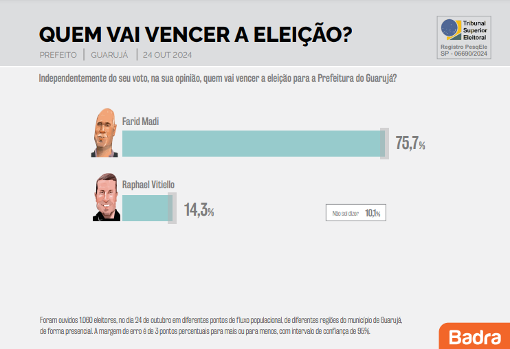 Quando os eleitores foram questionados: “Independentemente do seu voto, na sua opinião, quem vai vencer a eleição para a prefeitura de Guarujá?”, Farid Madi aparece com 75,7% e Raphael Vitiello com 14,3%. Não souberam dizer, 10,1%.