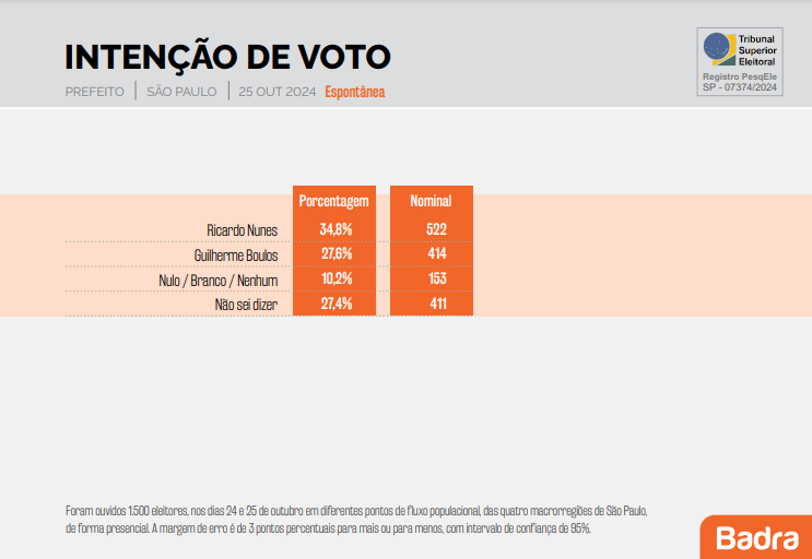 Na pesquisa espontânea de intenção de voto, Ricardo Nunes lidera com 34,8%. Atrás, aparece Guilherme Boulos, com 27,6%. Votariam em nulo/branco/nenhum 10,2% e não souberam dizer, 27,4%.