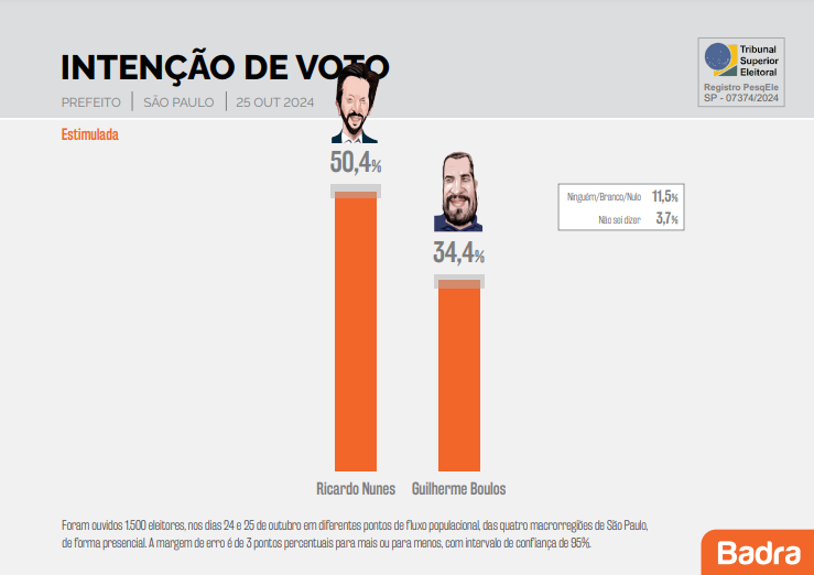 Na pesquisa estimulada, Ricardo Nunes aparece liderando com 50,4% dos votos, e em seguida Guilherme Boulos, com 34,4%. Votariam em branco/nulo/ninguém, 11,5%, e não souberam dizer, 3,7%.