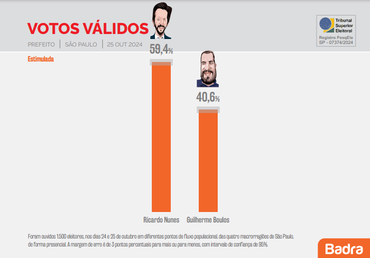 Nos votos válidos, excluindo abstenções, brancos e nulos, Ricardo Nunes aparece liderando com 59,4% dos votos, e atrás Guilherme Boulos, com 40,6%.