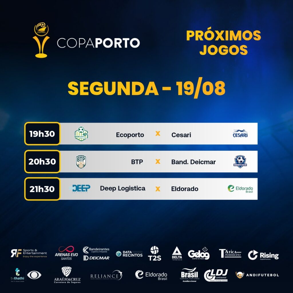 A segunda rodada da Copa Porto de Futebol Society tem sequência nesta segunda-feira com mais três jogos na Arena Evo. O principal confronto da noite será o último, programado para as 21h30, em que Deep Logística e Eldorado Brasil, que estrearam com vitória, se enfrentam em busca da liderança isolada do grupo 4.