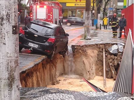 O buraco se abriu em frente a um terreno em obras, que fica rua Carlos Affonseca, no bairro Gonzaga, em Santos. A região da Baixada Santista está sendo afetadas por fortes chuvas, que causaram transtornos em diversas cidades.