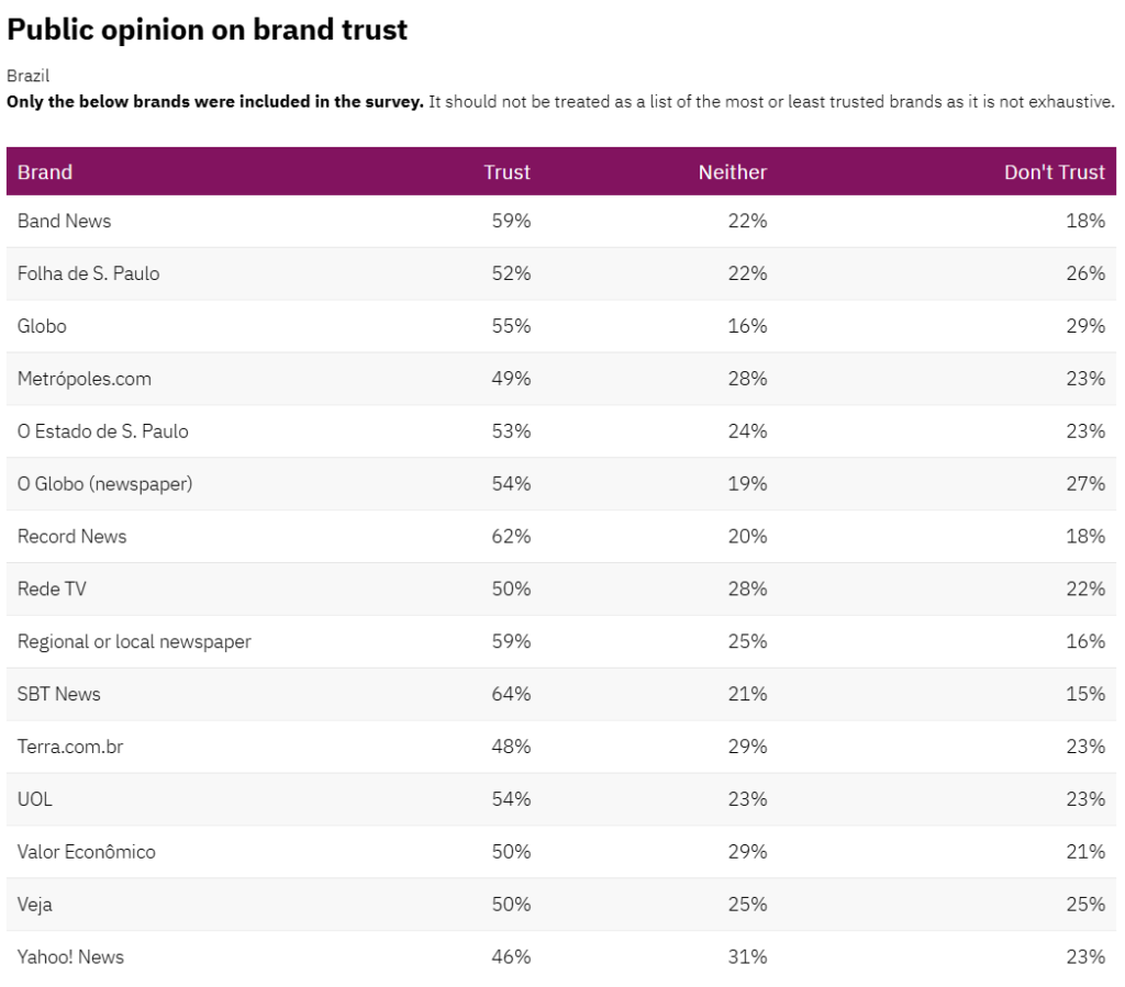 A Band News, aparece em terceiro lugar no ranking de canais de televisão que os brasileiros mais confiam ao consumir notícias. O canal aparece com 59% da confiança do público. Os dados são do relatório da Reuters, Digital News Report 2025.