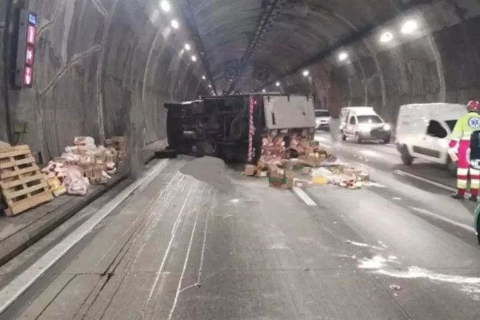Uma caminhonete tombou após perder o controle em um dos túneis da Rodovia Anchieta sentido sul sobre a faixa 3, na altura do km 53, em Cubatão.