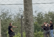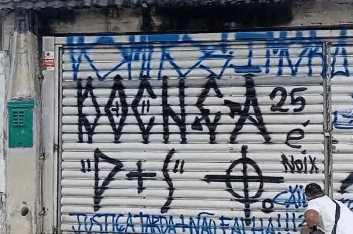 A casa usada pelos criminosos como base para planejar a execução do ex-delegado Ruy Ferraz Fontes, localizada na Praia Grande, foi pichada com a frase “Justiça tarda + não falha”. Na imagem, é possível ver o momento em que um homem está pichando o portão.