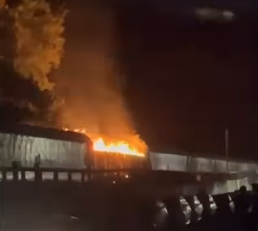 Dois vagões com cargas de celulose foram atingidos por um incêndio criminoso na noite de terça-feira (21), por volta das 19h15, em São Vicente, nas proximidades da estrada do Paratinga.