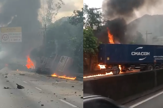 A colisão foi causada após uma das carretas bater na outra após perder o controle, em seguida, a carreta tombou e pegou fogo.