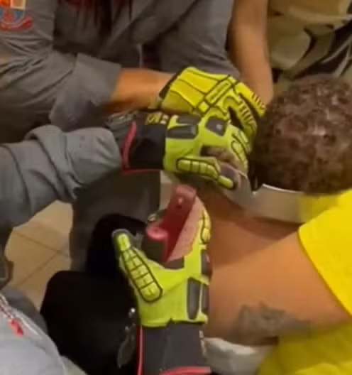 As imagens obtidas pelo TH+ portal mostram os bombeiros utilizando alicates para abrir a forma, cortar e tirar com segurança o material do corpo do bebê.