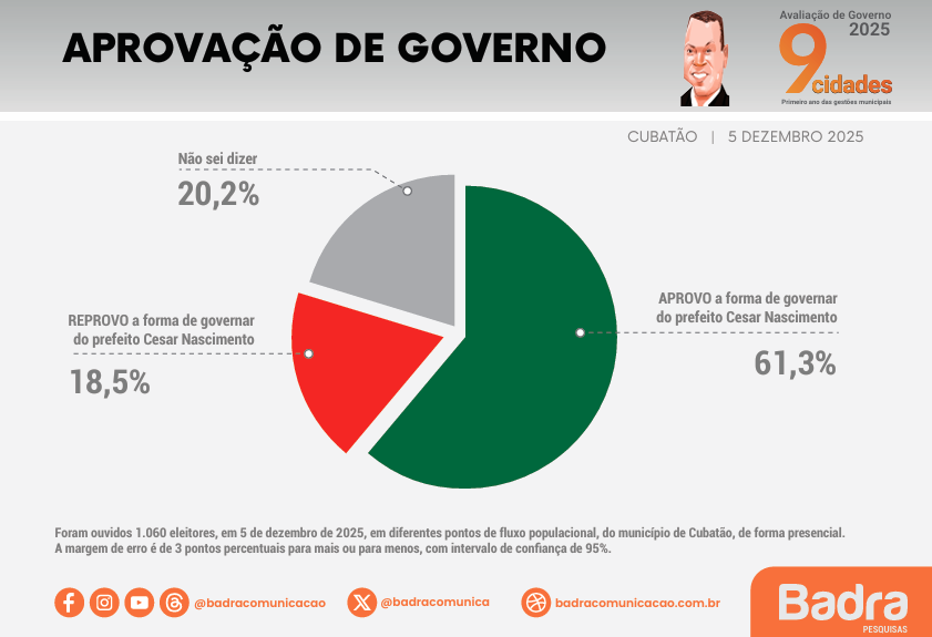 Segundo pesquisa do Instituto Badra, o prefeito de Cubatão, César Nascimento, tem a aprovação na forma de governar em relação ao seu primeiro ano de mandato, de 61,3% dos moradores-eleitores da cidade.