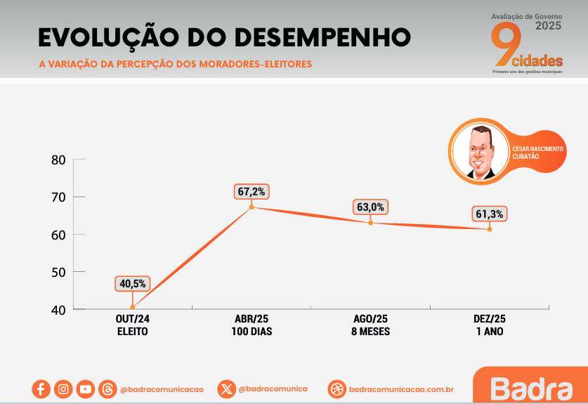 Em relação a evolução do desempenho, em dezembro de 2025, César possui 61,3%, o que representa um crescimento de mais de 20%, em comparação a quando foi eleito em outubro de 2024 com 40,5%.