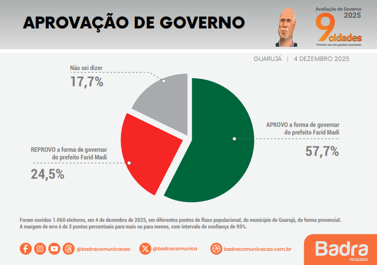 Segundo pesquisa do Instituto Badra, o prefeito de Guarujá, Farid Madi, tem a aprovação de 57,7% os moradores-eleitores na forma de governar neste mandato.
