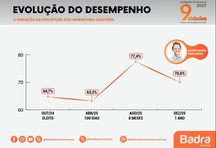 Segundo pesquisa do Instituto Badra, o prefeito de Praia Grande, Alberto Mourão, tem a aprovação de 70% dos eleitores na sua forma de governar a cidade, em relação ao ano de 2025.