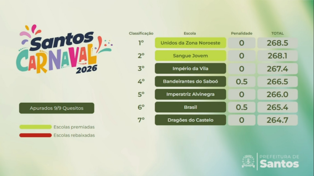 A Unidos da Zona Noroeste é a grande campeã do Grupo de Acesso do carnaval de Santos em 2026. A escola venceu com 268.5 pontos na apuração que aconteceu no Teatro Municipal Brás Cubas, no bairro Vila Mathias, no início da tarde desta terça-feira (10).
