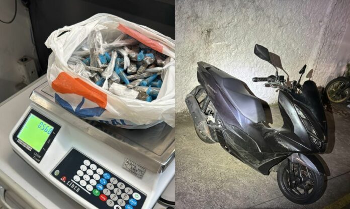 A moto encontrada com os indivíduos possuía registro de furto. Os indivíduos foram conduzidos ao CPJ, onde a autoridade de plantão adotou as medidas cabíveis: o homem maior de idade foi preso por tráfico de drogas, enquanto o menor foi qualificado por tráfic, receptação e ato infracional por conduzir veículo sem CNH.