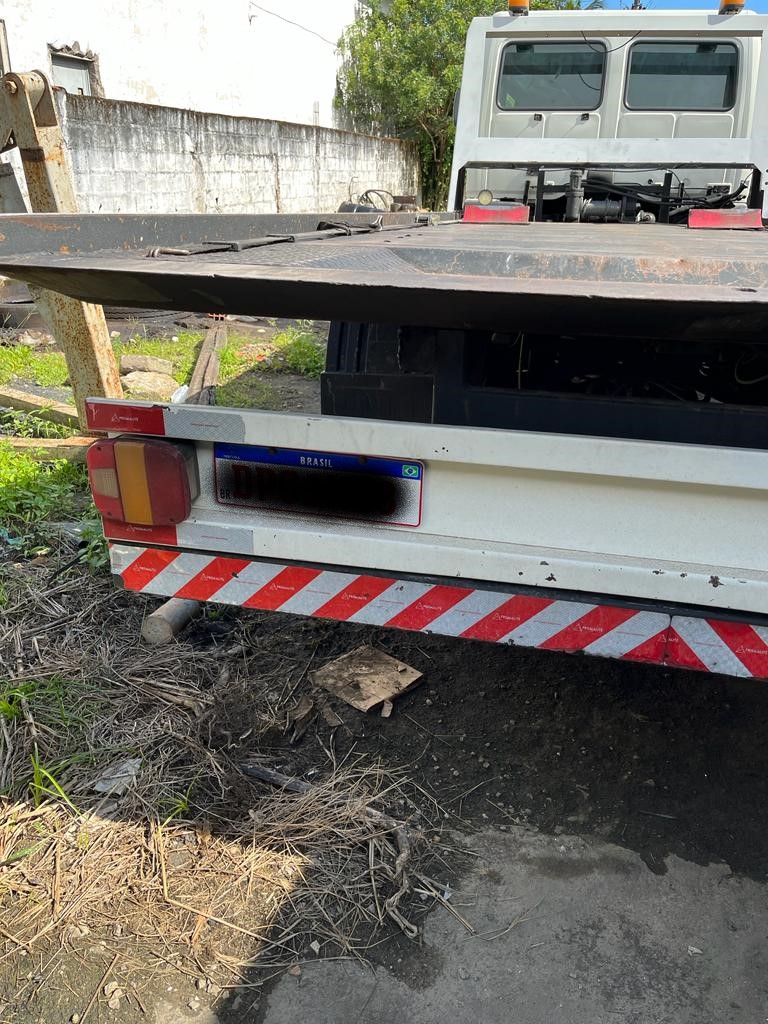 No mesmo terreno os policiais apreenderam um caminhão guincho de plataforma. Segundo a dupla, o veículo seria o próximo a ser desmontado e cortado. Também foram localizadas duas placas e uma longarina, pertencente a chassi de caminhão cuja numeração estava apagada com uso de solda impedindo a identificação do veículo.