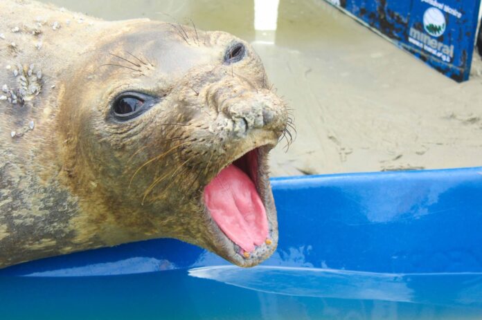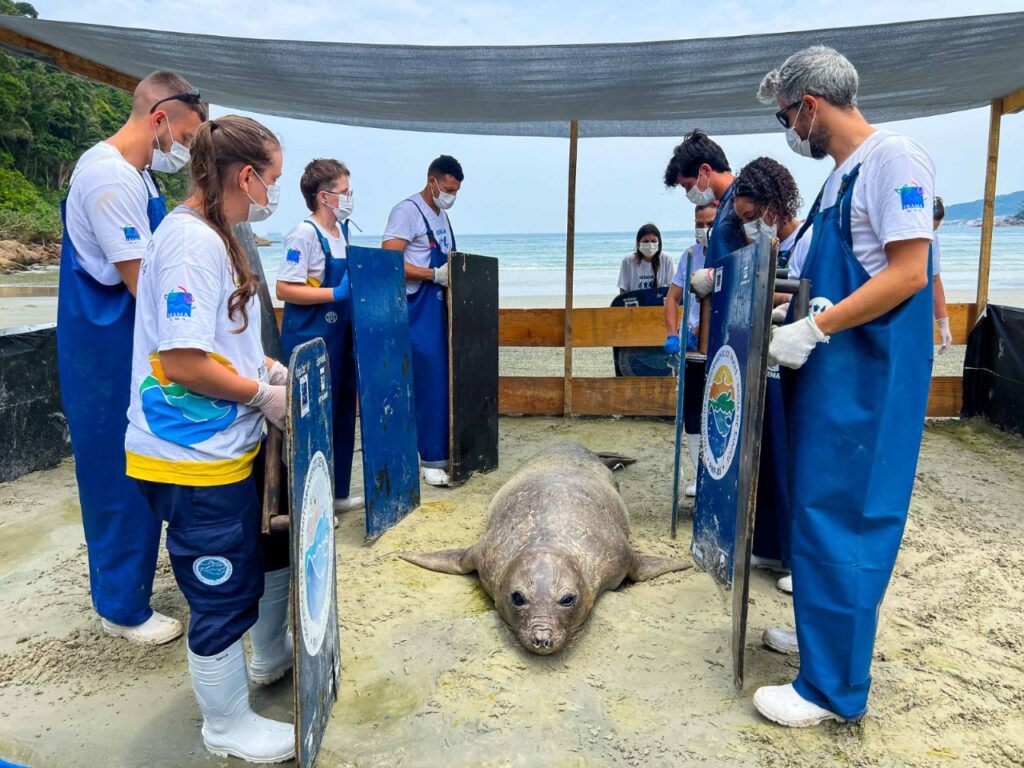 O elefante-marinho fêmea (Mirounga leonina), que havia sido encontrado encalhado no dia 13, na Praia das Astúrias, em Guarujá, litoral paulista, voltou ao mar na tarde da última quarta-feira (20), após uma semana sob os cuidados da equipe do Instituto Gremar.