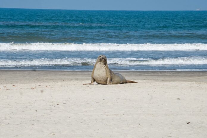 Um elefante-marinho fêmea, da espécie Mirounga leonina, foi avistado próximo à plataforma de pesca de Mongaguá.