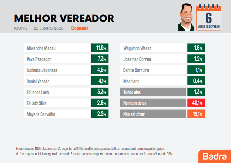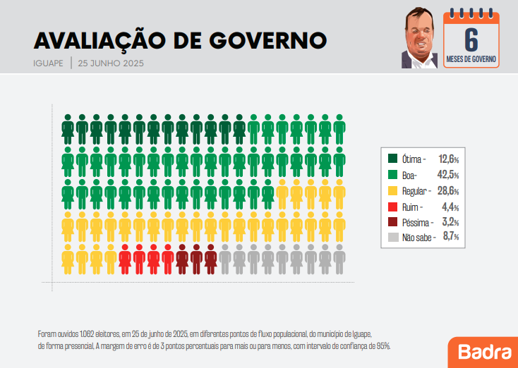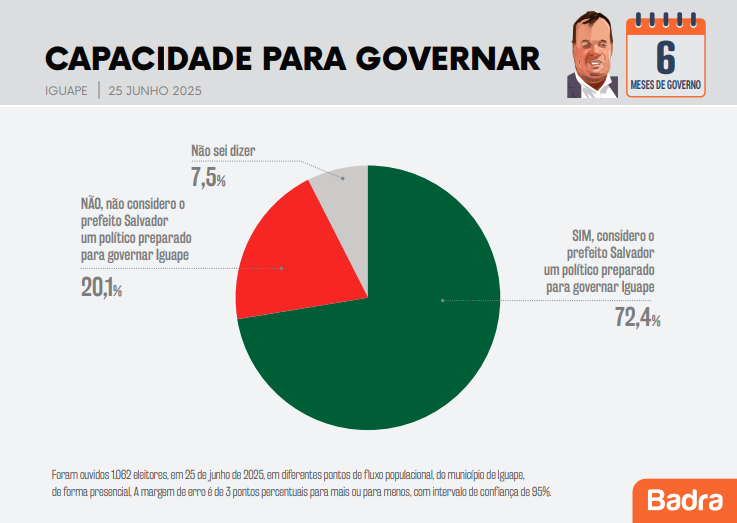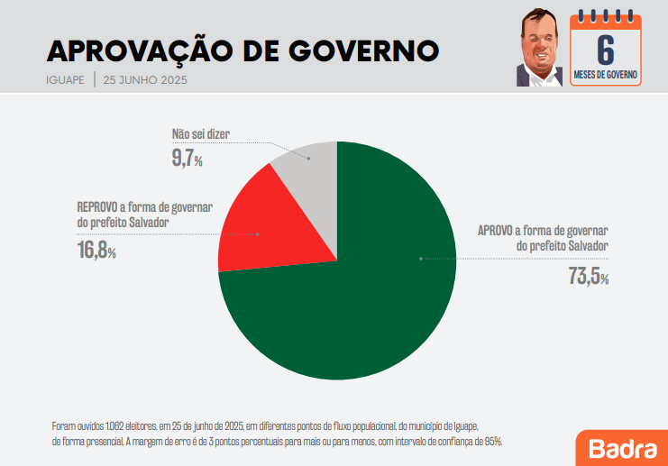 O levantamento ouviu 1.060 pessoas moradores-eleitores de Iguape no dia 25 de junho de 2025. A margem de erro é de três pontos percentuais para mais ou para menos, com intervalo de confiança de 95%. A amostra, em termos de perfil, segue a proporção de eleitore presentes do universos para as variáveis de região de moradia, sexo e faixa etária, escolaridade e renda familiar.