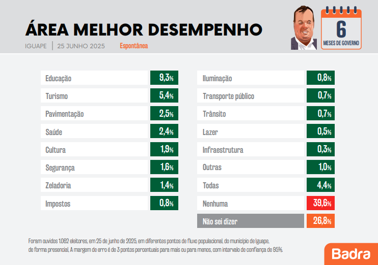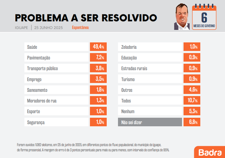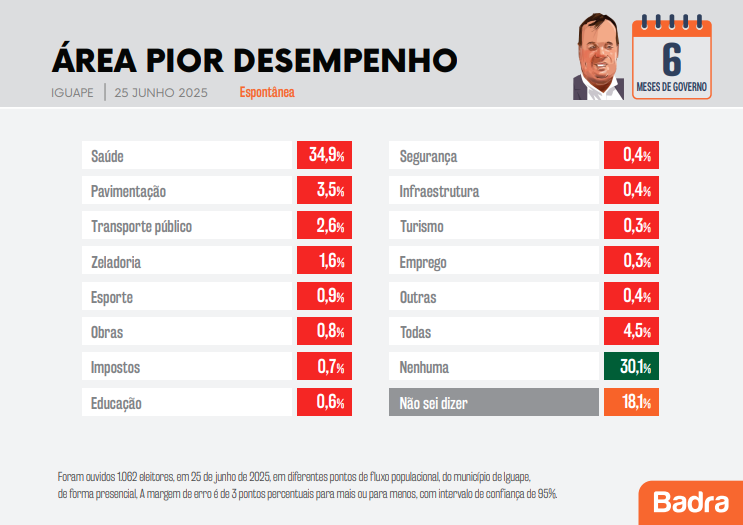 A saúde foi escolhida por 34,9% dos eleitores como a área de pior desempenho da gestão nos últimos seis meses e também a área foi apontada como o principal problema a ser resolvido no mandato. Apesar disso, 72,4% dos eleitores consideram Salvador um político preparado para governar Iguape.