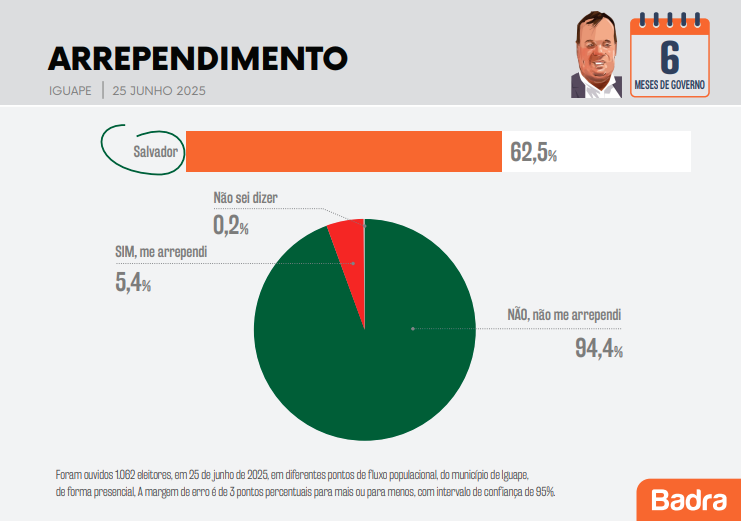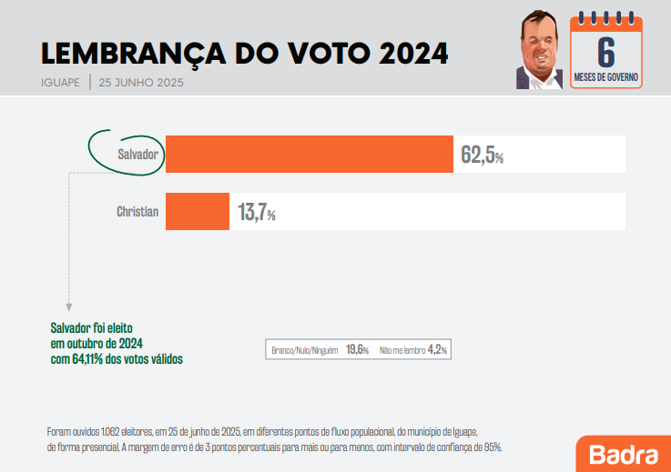 Eleito prefeito de Iguape nas eleições de 2024 com 64,11% dos votos válidos, Salvador (UNIÃO), neste primeiro semestre de 2025 tem uma boa aprovação em relação a seu governo. Segundo pesquisa do Instituto Badra, seu mandato tem agradado 73,5% dos munícipes-eleitores locais.