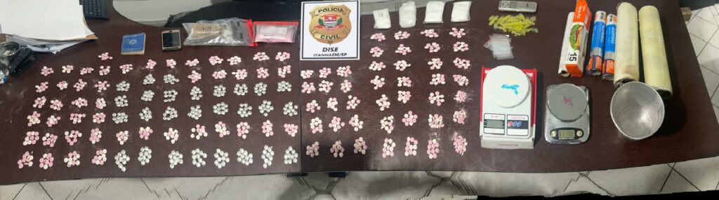 Também foram apreendidos 1160 comprimidos embalados de forma unitária para a venda, bem como itens utilizados para o preparo das drogas, como dois rolos de papel alumínio, 2 rolos de papel filme, 400 unidades de saquinhos plásticos vazios e duas balanças de precisão.