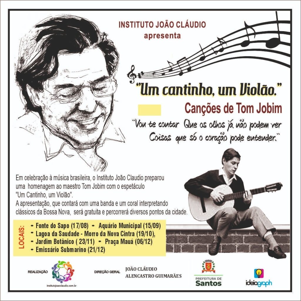 Em celebração à música brasileira, o Instituto João Claudio preparou homenagem ao maestro Tom Jobim com o espetáculo “Um Cantinho, um Violão”. A apresentação, que contará com uma banda e um coral interpretando clássicos da Bossa Nova, será gratuita e percorrerá diversos pontos da cidade.