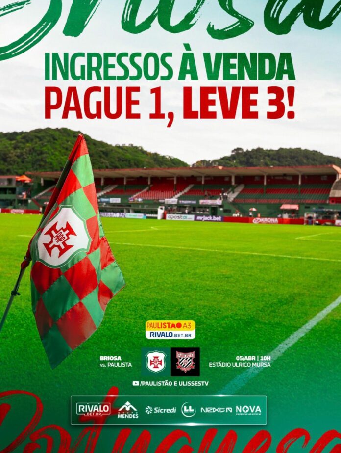 A Portuguesa Santista precisa vencer o jogo de volta das quartas de final do Campeonato Paulista Série A3 se quiser seguir em busca do retorno à Série A2 do estadual. Pensando na classificação para as semifinais, a Briosa criou uma promoção especial: na compra de um ingresso, o torcedor leva três para acompanhar a partida (Válido apenas para arquibancada descoberta).