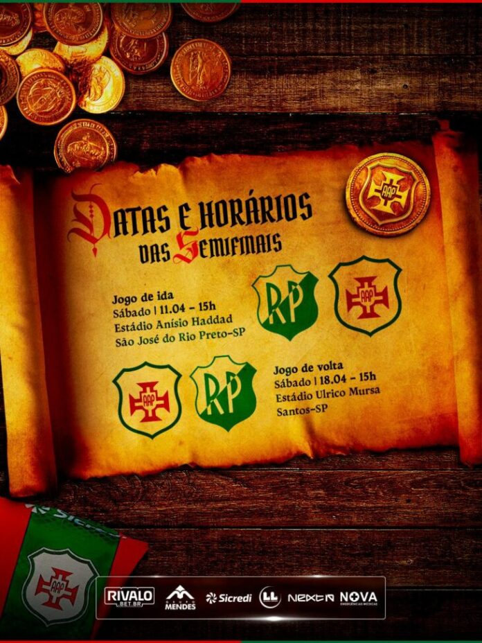A Federação Paulista de Futebol divulgou os dias e horários dos jogos de ida e volta entre Portuguesa Santista e Rio Preto, pelas semifinais do Campeonato Paulista Série A3.
