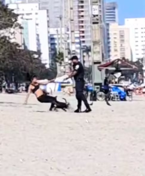 A Prefeitura Municipal de Santos, por meio da Secretaria de Segurança (Seseg), informou que “uma equipe da Guarda Civil Municipal (GCM) foi acionada por volta das 13h30, para uma ocorrência envolvendo pessoa em situação de rua com dois cães, de médio e grande porte, os quais estavam soltos na faixa arenosa, o que é proibido por lei municipal e representava risco de ataque dos animais”.