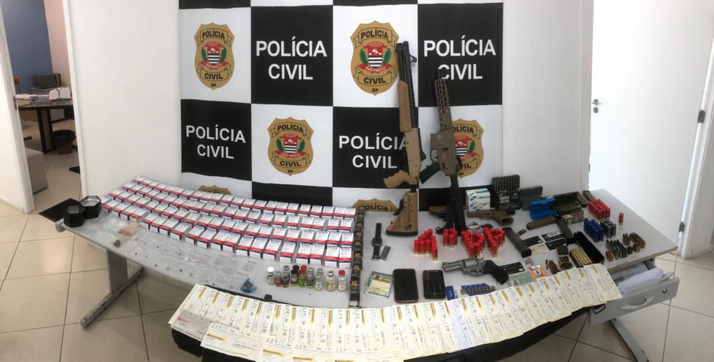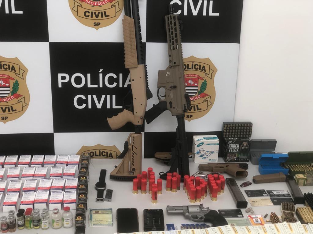O suspeito foi preso em flagrante pelos crimes de falsificação de medicamentos, tráfico de drogas, lavagem de dinheiro e porte de arma de fogo de uso permitido e restrito.