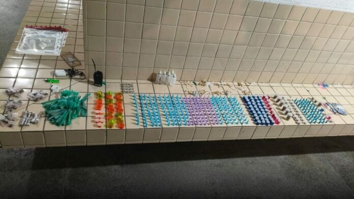 Na busca pessoal, foram encontrados um rádio comunicador, um celular e uma carteira. A sacola que o indivíduo arremessou foi encontrada e dentro dela haviam diversas porções de entorpecentes.