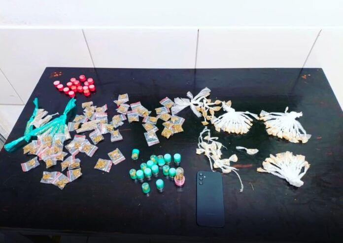 Na sacola foram encontradas drogas prontas para comercialização, além de um aparelho celular.