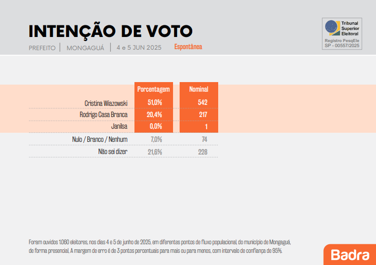 Na pesquisa espontânea de intenção de voto, Cristina Wiazowski lidera com 51%. Atrás, aparece Rodrigo Casabranca, com 20,4%, Janilsa, com 0,0%. Votariam em nulo/branco/nenhum 7% e não souberam dizer, 21,6%.