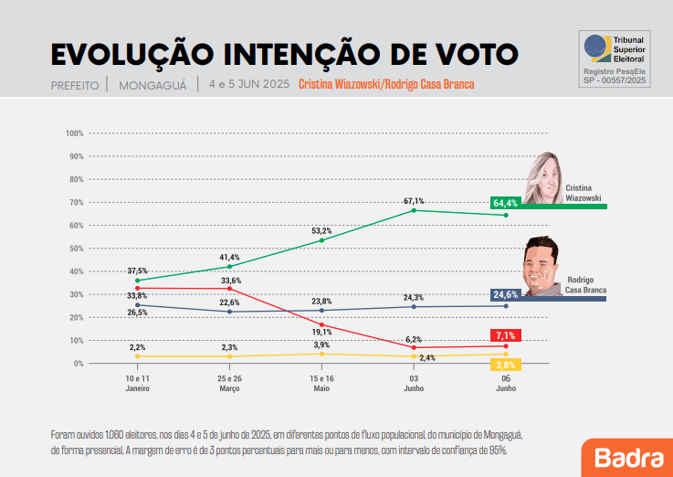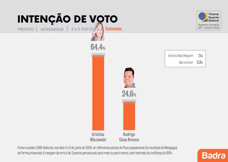Na pesquisa estimulada de intenção de voto, Cristina Wiazowski lidera com 64,4%. Atrás, aparece Rodrigo Casabranca, com 24,6%. Votariam em nulo/branco/nenhum 7,1% e não souberam dizer, 3,8%.
