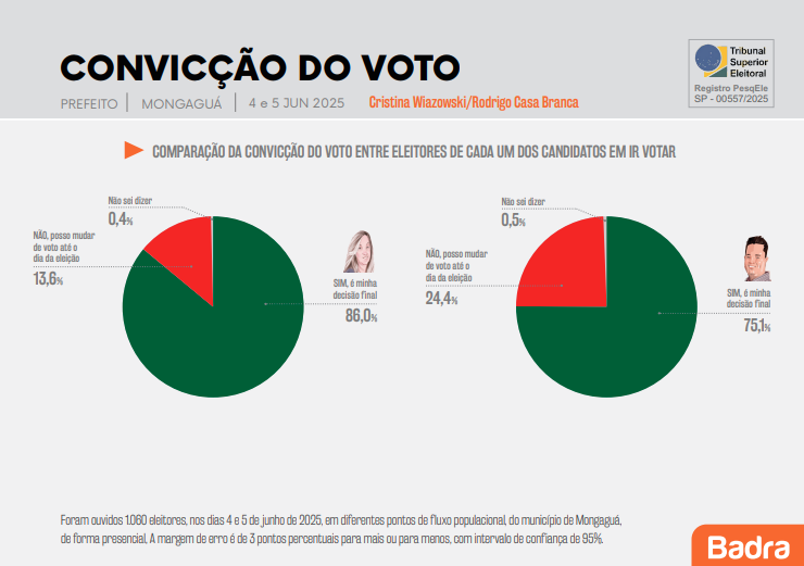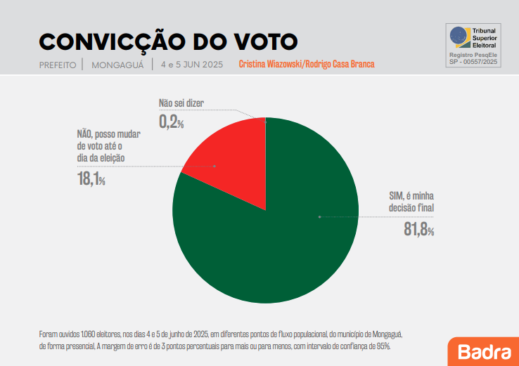 Quando questionados sobre a convicção do voto, 81,8% dos entrevistados alegaram que seria a decisão final, enquanto 18,1% responderam que poderia mudar até o dia da eleição e 0,2% não souberam dizer. O cenário é parecido quando perguntado para os eleitores de cada candidato (veja abaixo).