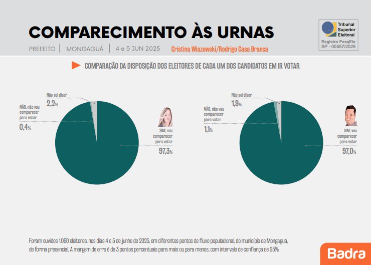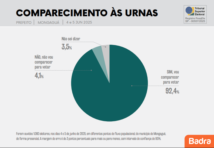 Os entrevistados também foram questionados se iriam comparecer às urnas para votarem na eleição suplementar da cidade. Ao todo, 92,4% confirmaram que sim, enquanto 4,1% disseram que não irão votar, e 3,5% não sabe.