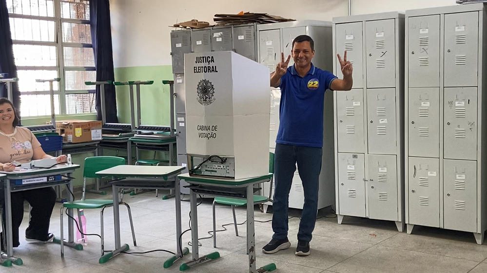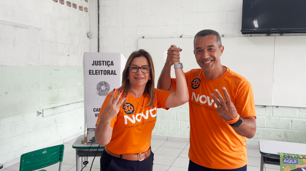 Silvio de Oliveira, conhecido como Silvinho Investigador (NOVO), votou por volta das 9 horas da manhã no colégio Dagoberto Nogueira da Fonseca, acompanhado da vice, Irene Freitas Charif. Após apertar ‘confirmar’, ambos comemoraram.