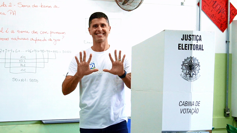 O candidato Tiago Cervantes (PSD), votou na Escola Estadual Benedito Calixto por volta das 8 horas da manhã, acompanhado da esposa Elimara e a filha Maiara. Tiago, após confirmar nas urnas posou para fotos com o número estampado nas mãos e na camisa.
