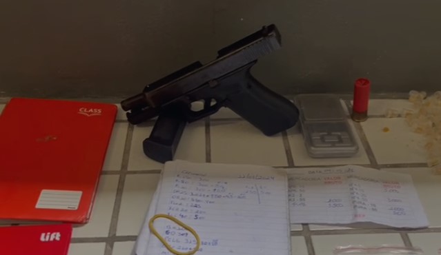 Próximo do local onde foi capturado, os policiais encontraram uma mochila contendo uma balança de precisão, três cadernos e uma folha com anotações da venda de drogas, uma pistola 9 milímetros municiada com 14 munições, cartuchos e um cartucho calibre 12mm. Também foram apreendidas 2.730 kg de maconha, 1.930 kg de cocaína, além de 397 gramas de maconha K2, e 347 gramas de crack.