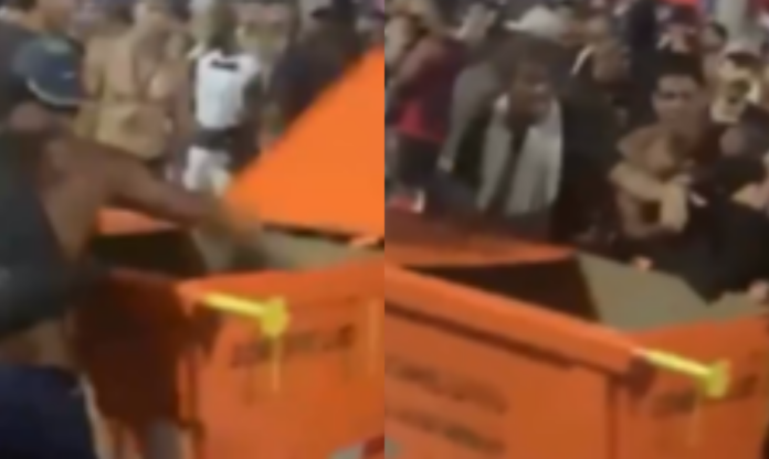 Durante uma tentativa de assalto, um ladrão foi espancado por um grupo de pessoas, e jogado dentro de um contêiner de lixo. A movimentação chamou a atenção da Rondas Especiais e Controle das Multidões (Recom), da Polícia Militar, que foram ao local para deter os envolvidos. Veja o vídeo: